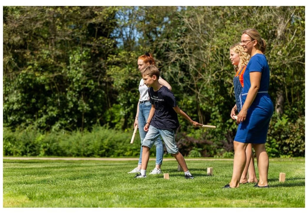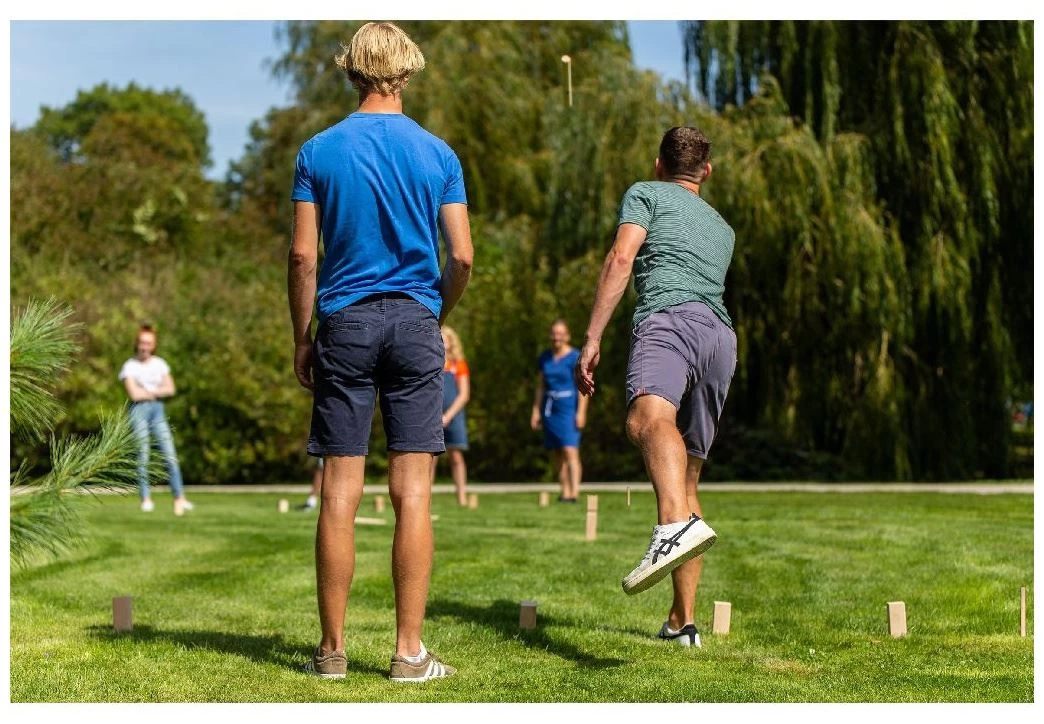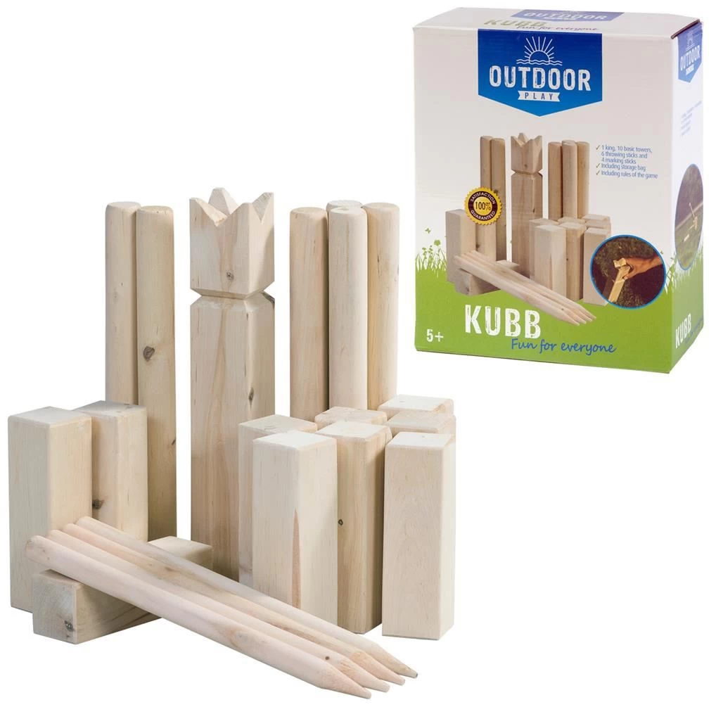 Outdoor Play Kubb Game. Versla de tegenpartij en werp met de werpstokken alle basistorens om! Probeer daarna de koning te verslaan en win het spel! Inhoud: 21 houten onderdelen. Afmetingen: 10 basistorens 4,5 x 4,5 x 15 cm, 6 werpstokken 3,3 x 3,3 x 31 cm, 4 markeerstokken 1,8 x 1,8 x 30 cm, 1 koning 5,3 x 5,3 x 31 cm.