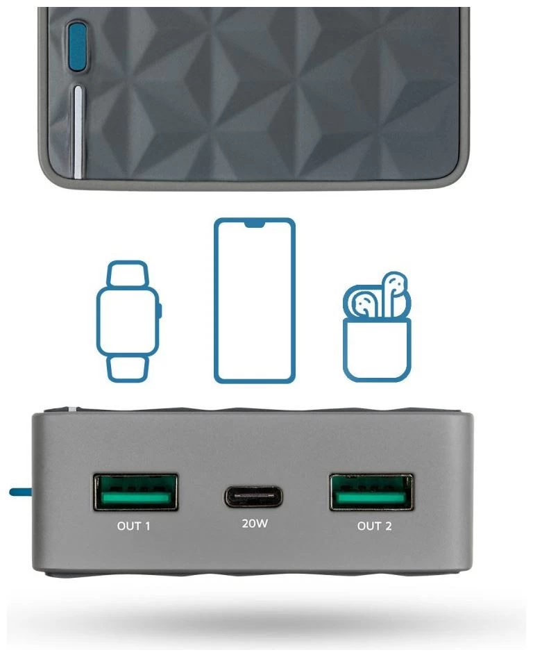 Une banque d’alimentation compacte et lĂ©gère avec des indicateurs de charge. Dispose d’une batterie interne de 20000 mAh avec suffisamment d’Ă©nergie pour recharger complètement un smartphone 7 Ă 8 fois. Avec cet accessoire indispensable, les appareils peuvent ĂŞtre rechargĂ©s n’importe oĂą sans aucun problème. Par exemple, un tĂ©lĂ©phone portable, une tablette, un système de navigation, un lecteur de musique ou un autre appareil peut ĂŞtre alimentĂ© en Ă©nergie supplĂ©mentaire. Recharge jusqu’Ă 2x plus rapidement qu’une prise de courant via l’USB-C de 20W et peut charger 2 appareils en mĂŞme temps.